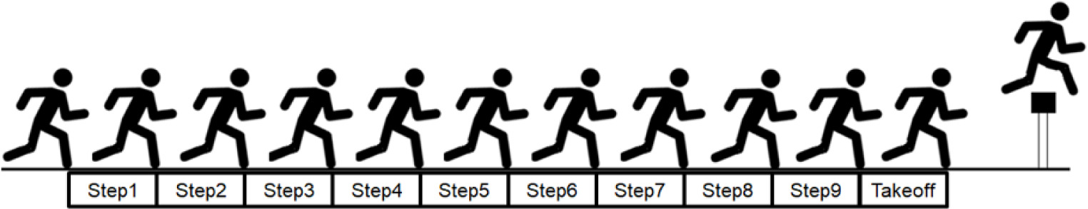 The total times for the 3000 m steeplechase races were obtained from the results documents. The analysis focused on the 10 steps immediately preceding obstacle clearance. All steps from the participants were digitalised using Kinovea (version 0.9.5). The endpoints of the segments were determined by the researchers. The step rate of the ten steps before takeoff were analysed (Figure 1). The time per step was determined from the frames captured by a high-speed camera. The step rate was the step frequency from the ten steps toe on before the hurdle to the takeoff and was determined as the inverse of the time per step (1/time per step). Comparisons of the 10-step step rate were made both across laps and among the individual steps.