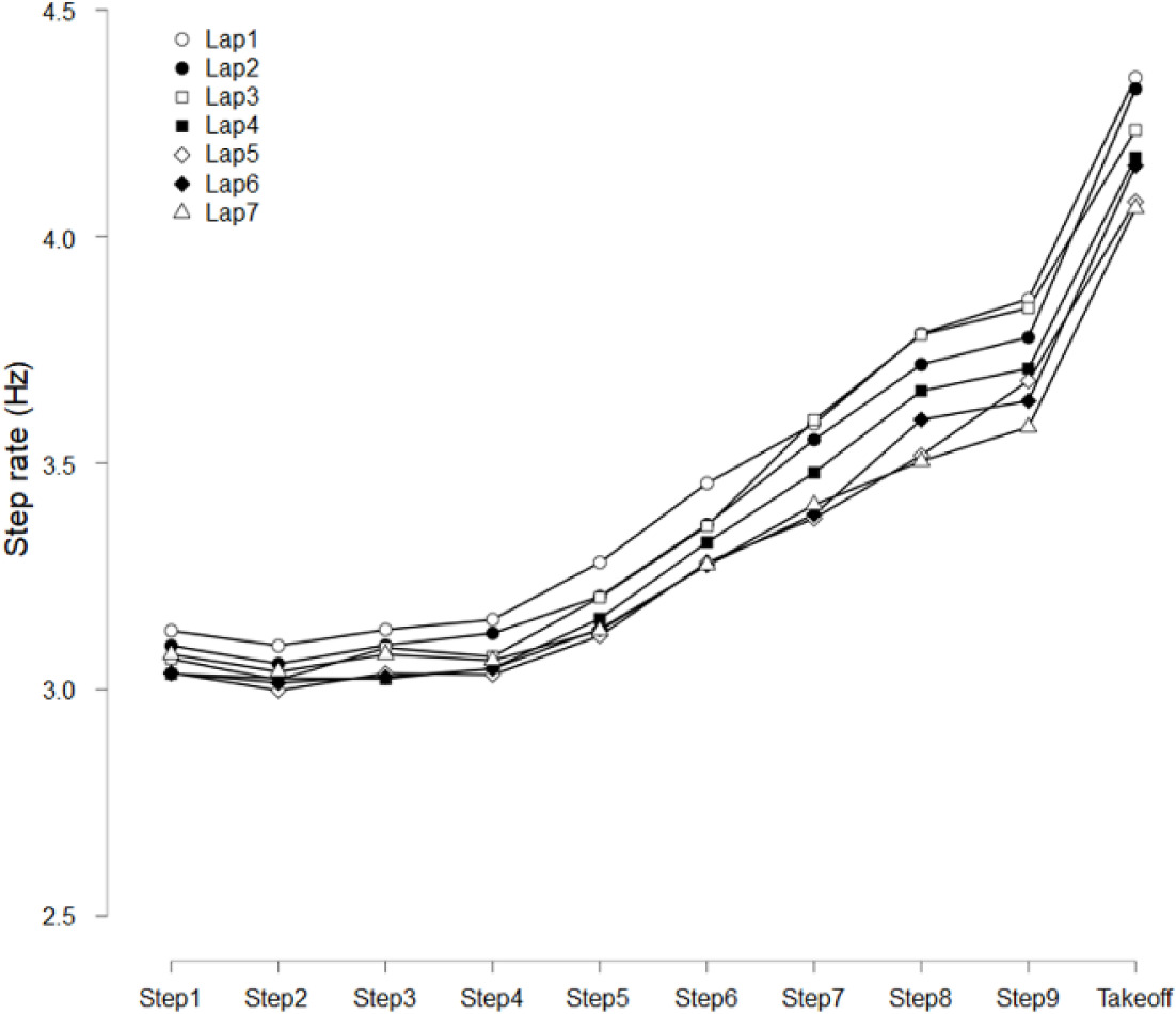 Post-hoc analyses revealed significant differences in the step rate across different steps within each lap (ps < 0.05, Table 2). Specifically, for laps 1–6, steps 6–9 and takeoff consistently exhibited higher step rates compared to steps 1–4. Step 5 showed lower step rates than steps 7–9 and takeoff. Step 6 had a lower step rate than steps 8, 9, and takeoff. Step 7 had a lower step rate than steps 8, 9, and takeoff. Finally, steps 8 and 9 had lower step rates than takeoff. For lap 7, steps 7–9 and takeoff had higher step rates compared to steps 1, 3, 4, and 5. Steps 6–9 and takeoff had higher step rates compared to step 2. Steps 8, 9, and takeoff had higher step rates than step 6. Step 9 and takeoff had higher step rates than step 7. Finally, steps 8 and 9 had lower step rates than takeoff.