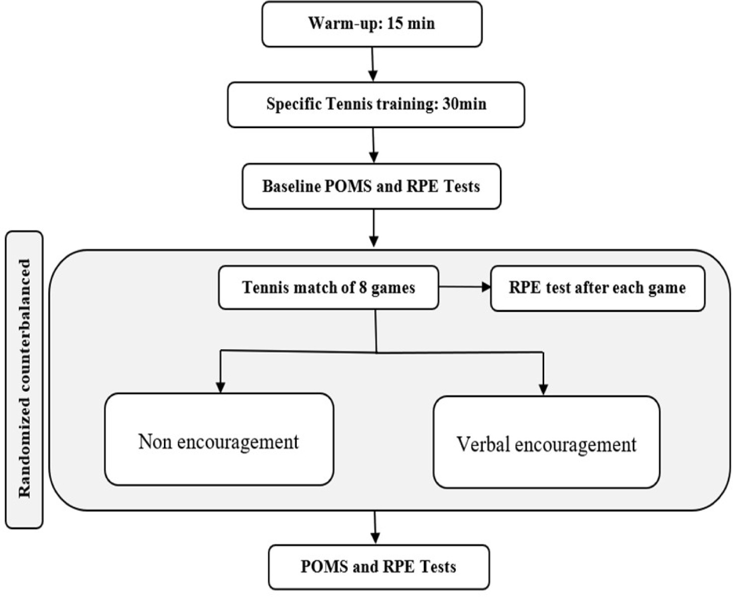 In each testing session, subjects were assigned to one of the two encouragement conditions: non-encouragement and positive verbal encouragement. Subjects were randomly assigned to perform the two experimental conditions with the help of an online random number generator (Research Randomizer 4.0). A minimum of 48 hours and a maximum of 72 hours were permitted between testing sessions to ensure adequate recovery while minimising detraining effects [26]. This interval was specifically selected based on research demonstrating that young tennis players typically recover physiologically and psychologically from competitive play within 24–48 hours [27], while avoiding potential skill decay that might occur with longer intervals. In each testing session, subjects completed the same pre-match training load (30 min of specific tennis training), and POMS and RPE were collected 5 min afterwards, to establish baseline values, as well as after the 8-game match routines (Figure 1). RPE was also assessed after each game. This is also useful for determining natural day-to-day fluctuations in performance.