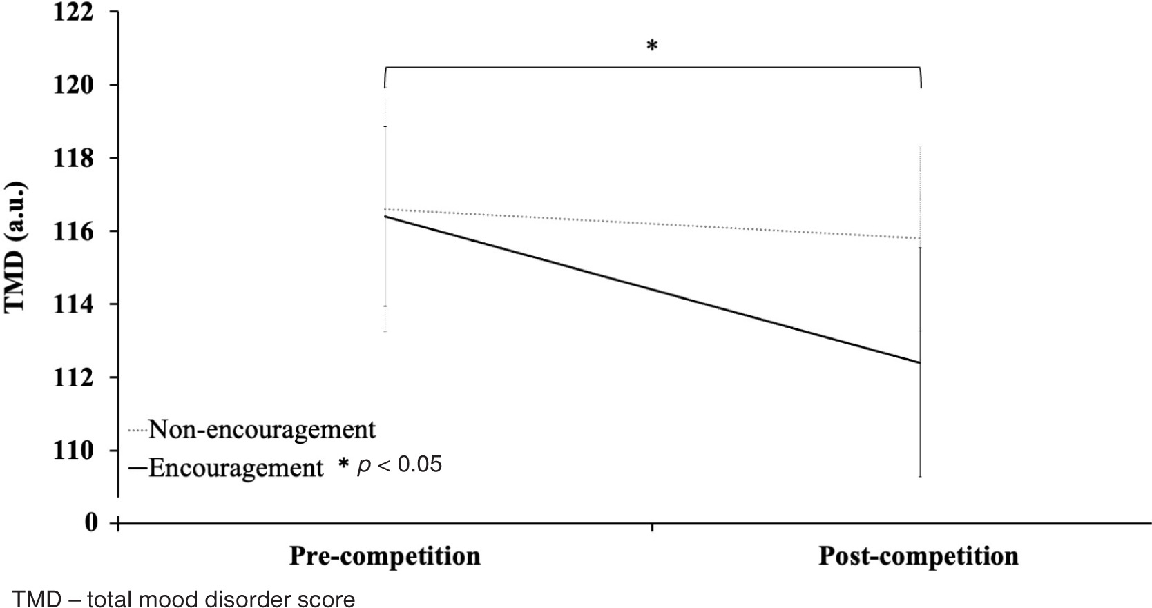 There was a statistically significantly small effect of the encouragement [p = 0.017, ηp2 = 0.49 (small), ώ = 0.74] and time [p < 0.001, ηp2 = 0.88 (moderate), ώ = 0.74] factors with a significant interaction between the encouragement and time factors [p = 0.025, ηp2 = 0.45 (small), ώ = 0.67)] (Table 2). Pairwise comparisons at post-competition showed that the TMD score was significantly lower following ‘verbal encouragement’ [p = 0.014, d = 0.93 (moderate)] compared to the non-encouragement condition (Figure 2). In addition, for the ‘verbal encouragement’ condition, the TMD scores decreased significantly [p < 0.001, d = 1.44 (large)] after the competition compared to the pre-competition scores (Figure 2). To contextualise these statistical findings in practical terms for youth tennis contexts, the 2.9% reduction in TMD scores following verbal encouragement represents a meaningful shift in psychological state during competitive play. Based on established minimal clinically significant difference thresholds for mood assessments in youth sport, this magnitude of change likely reflects a practically significant improvement in emotional state that could enhance training adherence and sport enjoyment, which are critical factors for long-term athletic development in this age group.