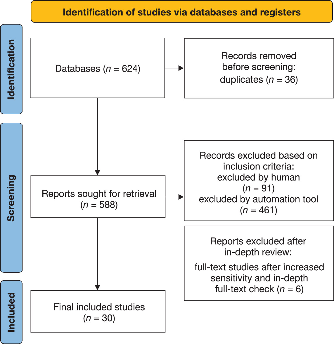 A total of 624 studies were found by searching databases and reviewing the studies’ reference lists. At first, a total of 36 studies were eliminated after the duplicates were reviewed. With regard to the inclusion criteria, 552 studies were excluded. From that point, a total of 36 studies were sought for retrieval, where an additional 6 studies were excluded (after an in-depth check). Ultimately, the systematic review consisted of a total of 30 full-text studies (Figure 1).