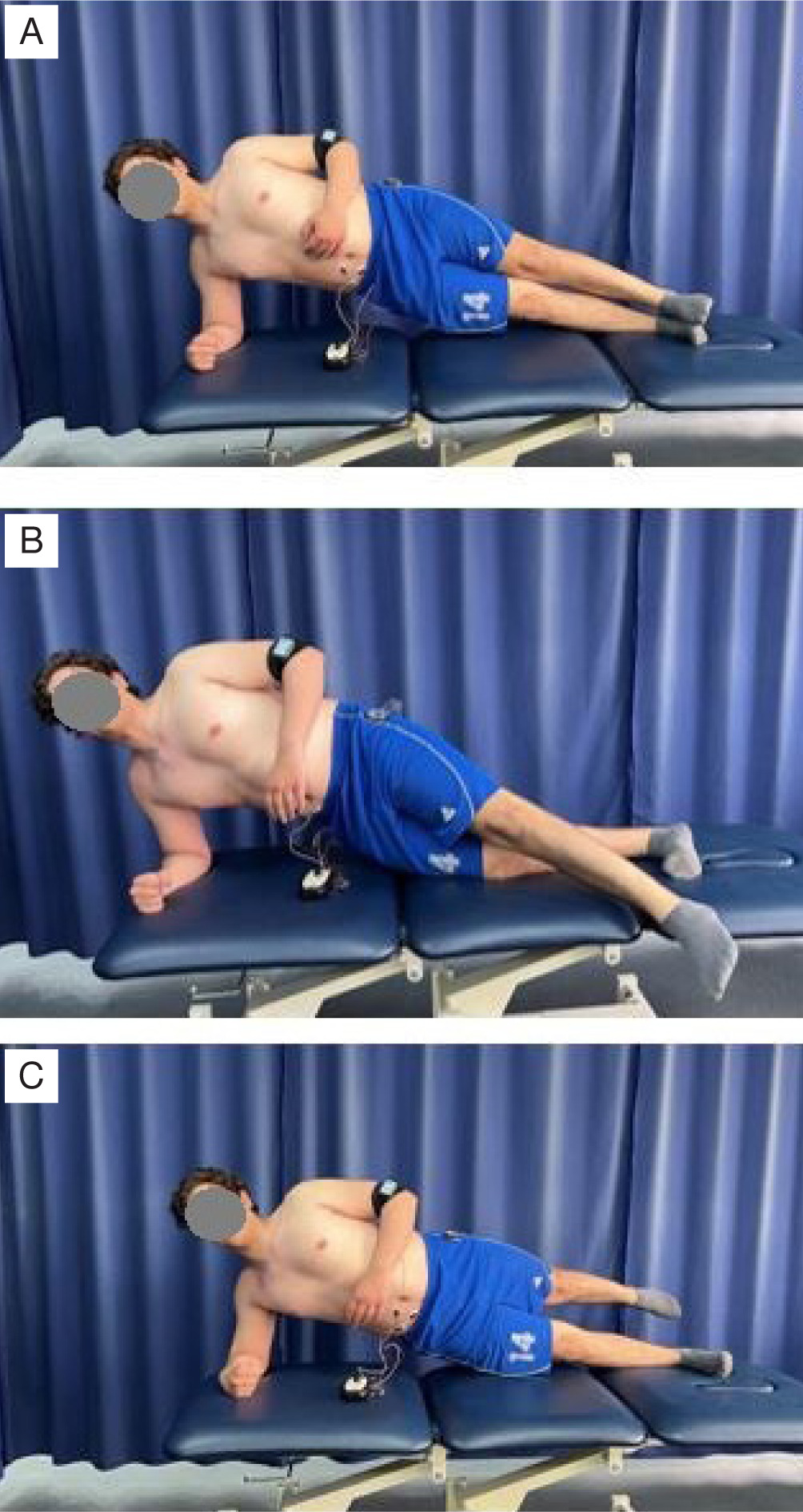Demonstration of the side bridge in neutral position (A), side bridge with 25° hip flexion (B), and side bridge with 25° hip extension (C)