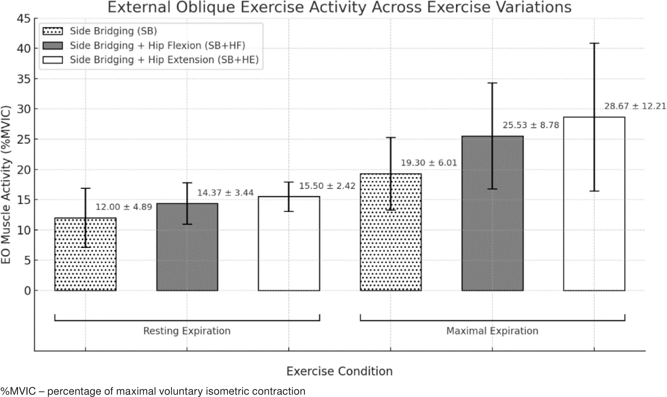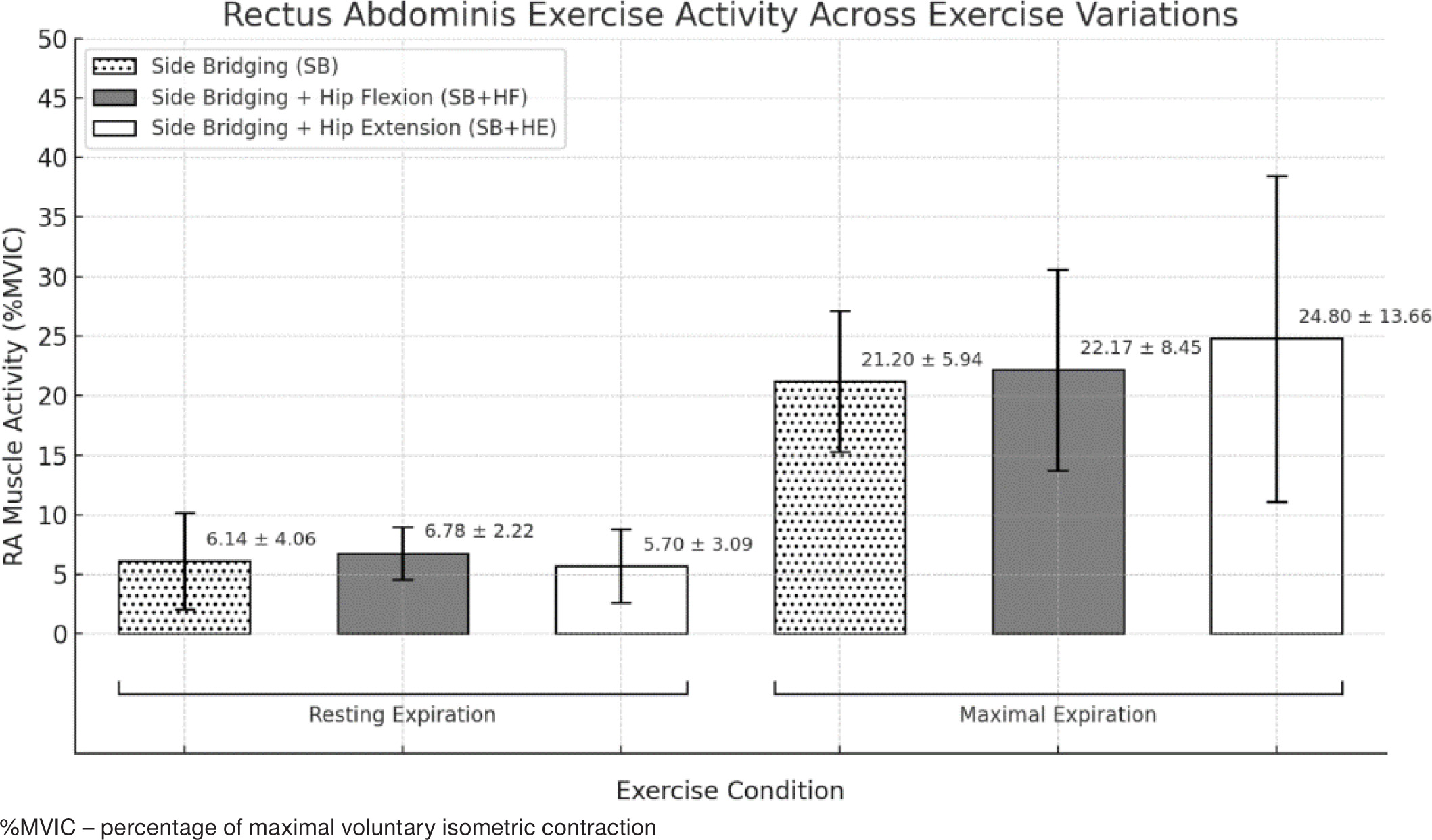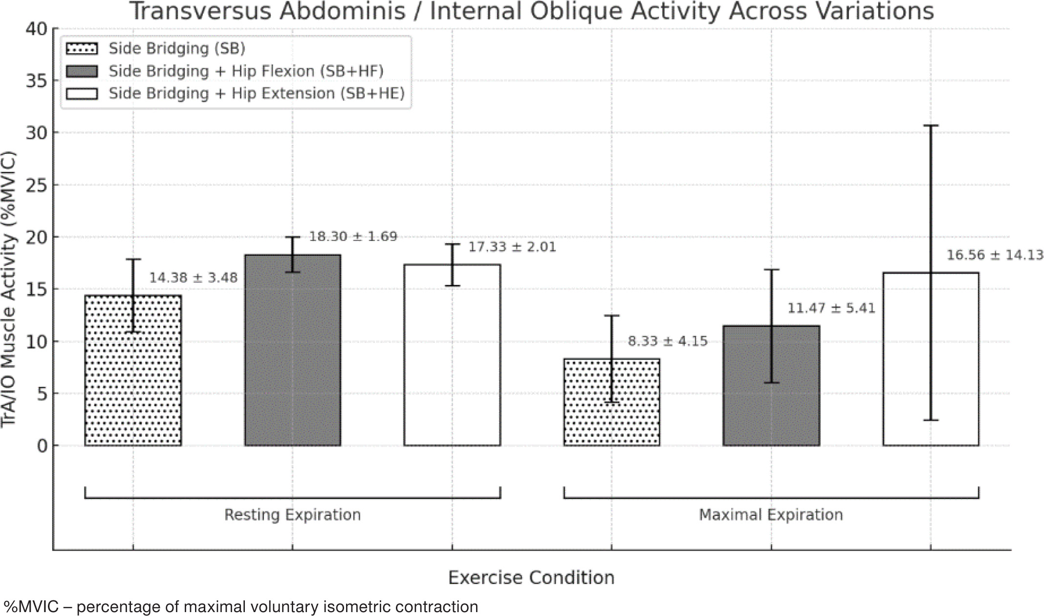 Furthermore, when combinations including RE were compared with those including ME, no significant difference was seen when comparing side bridging with hip extension and maximal expiration with its resting expiration counterpart (p = 0.201) as well as side bridging with resting expiration compared to side bridging and hip extension (p = 0.953) and hip flexion (p = 0.171) with maximal expiration. All the other pairwise comparisons revealed significant differences (p < 0.001; p = 0.002–0.003). Finally, the highest TrA/IO, %MVIC was seen in side bridging + hip flexion with resting expiration (SB+HF/RE). Figure 4 shows a chart representing the means and standard deviations of the transverse abdominis /internal oblique %MVIC during resting and maximal expiration (Table 4).