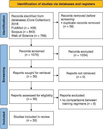 A total of 2,018 records were identified through database searches (PubMed, n = 406; Scopus, n = 843; Web of Science, n = 769). After the removal of 948 duplicates, 1,070 records remained for screening. Of these, 1,034 were excluded based on title and abstract. Thirty-six (36) full-text reports were retrieved and assessed for eligibility, with none being unobtainable. Following the assessment, six (6) studies [26, 31] were excluded because they did not include comparisons between training regimens. Ultimately, thirty (30) studies met the inclusion criteria and were incorporated into the review (Figure 1).
