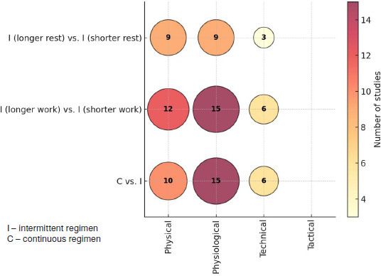 Evidence gap map of training regimen comparisons by outcome domain. Numbers in cells indicate the number of studies contributing to each cell.