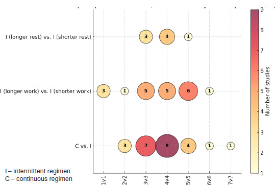 Analysis of study designs by format of play showed that most evidence was accumulated in 4v4, 3v3, and 5v5 SSGs, particularly when comparing continuous and intermittent regimens (Figure 3). For example, 9 studies contrasted continuous and intermittent structures in 4v4 formats, while 7 and 4 studies did so in 3v3 and 5v5, respectively. In contrast, evidence for larger formats (6v6, 7v7) or very small-sided designs (1v1, 2v2) remains unstudied, with only isolated comparisons reported. Intermittent–intermittent contrasts (longer vs shorter bouts or longer vs shorter recovery) have been studied in 3v3 to 5v5 formats but are virtually absent in 6v6 and 7v7.