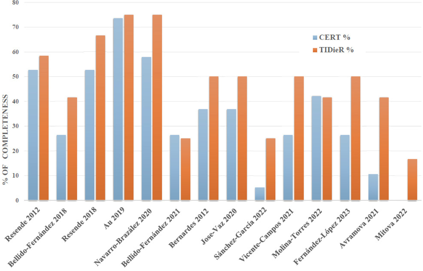The overall mean average for the TIDieR items for all articles included was 5.7 (SD = 2.1) out of 12 points (47.5%) while the average for the CERT items was 6.4 (SD = 3.9) items out of 19 (33.6%), resulting in low quality of reporting (> 60% of completeness). Figure 2 shows the individual total percentages of reporting for each article on both checklists. Only the study of Au et al. [26] obtained high-quality reporting standards on both assessment tools according to the cutoff score of 60%. Figures 3 and 4 display the results of completeness according to each item from the CERT and TIDieR checklists. The most described items were 1 and 2 (brief name and why) reported by 100% of selected articles, in contrast to items 9 and 10 (tailoring and modifications), which were not reported at all. Item 3 (what) was reported only by two articles (14.2%).