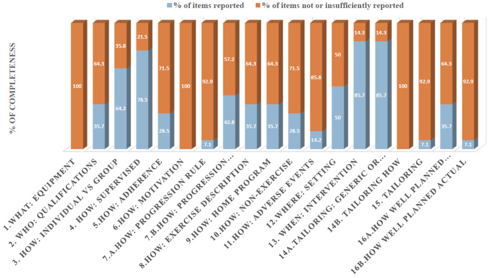 Percentage of completeness of reporting among randomised controlled trials for the Consensus on Exercise Reporting Template (CERT) checklist