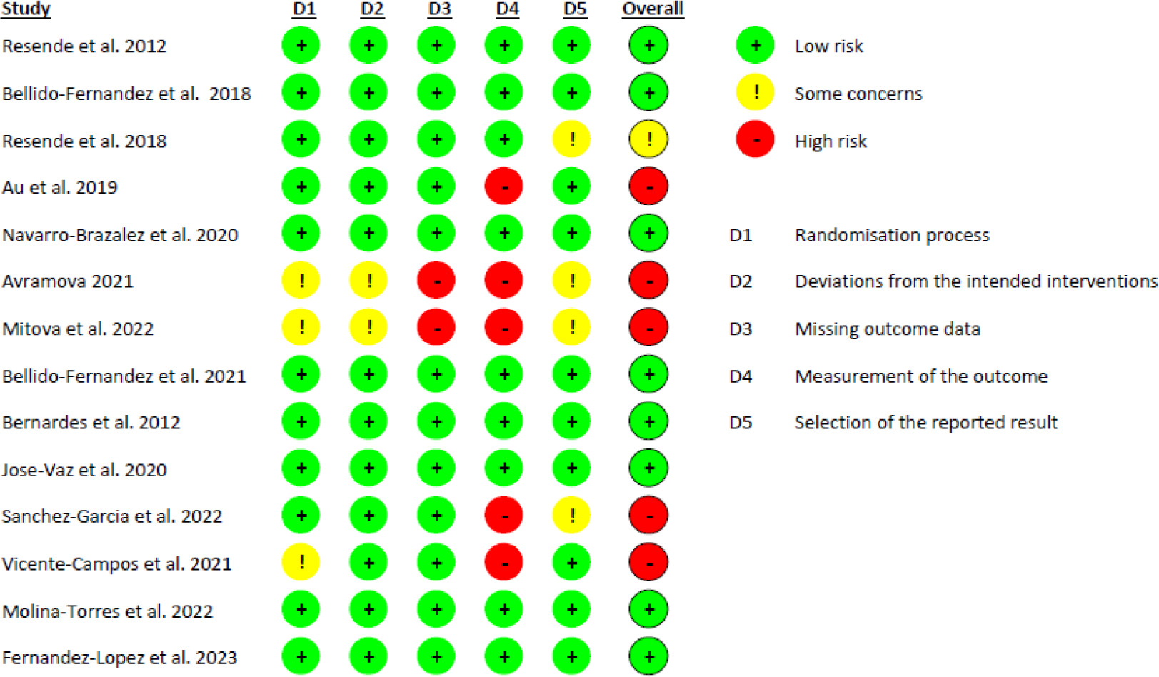 The risk of bias results of the included RCTs are displayed in Figure 5. Of the 14 RCTs, five were classified as ‘high risk’ [25, 26, 29, 30, 32], one as ‘some concerns’ [22], and eight as ‘low risk’ [1, 20, 21, 23, 24, 27, 28, 31]. Those RCTs classified as high risk were due to methodological issues with outcome measurement (5 studies, 35.7%), the selection of reported outcomes (3 studies, 21.4%), and the randomisation process (3 studies, 21.4%). In 100% of all included articles, domain 1 (bias due to the randomisation process) and domain 3 (missing outcome data) were low risk, with the bias unlikely to significantly alter the results. 28.5% of articles did not report a previous study protocol or trial registration, which led to the decision of ‘some concerns’ (domain 5). Two articles had some concerns and high risk in all five domains [25, 29].